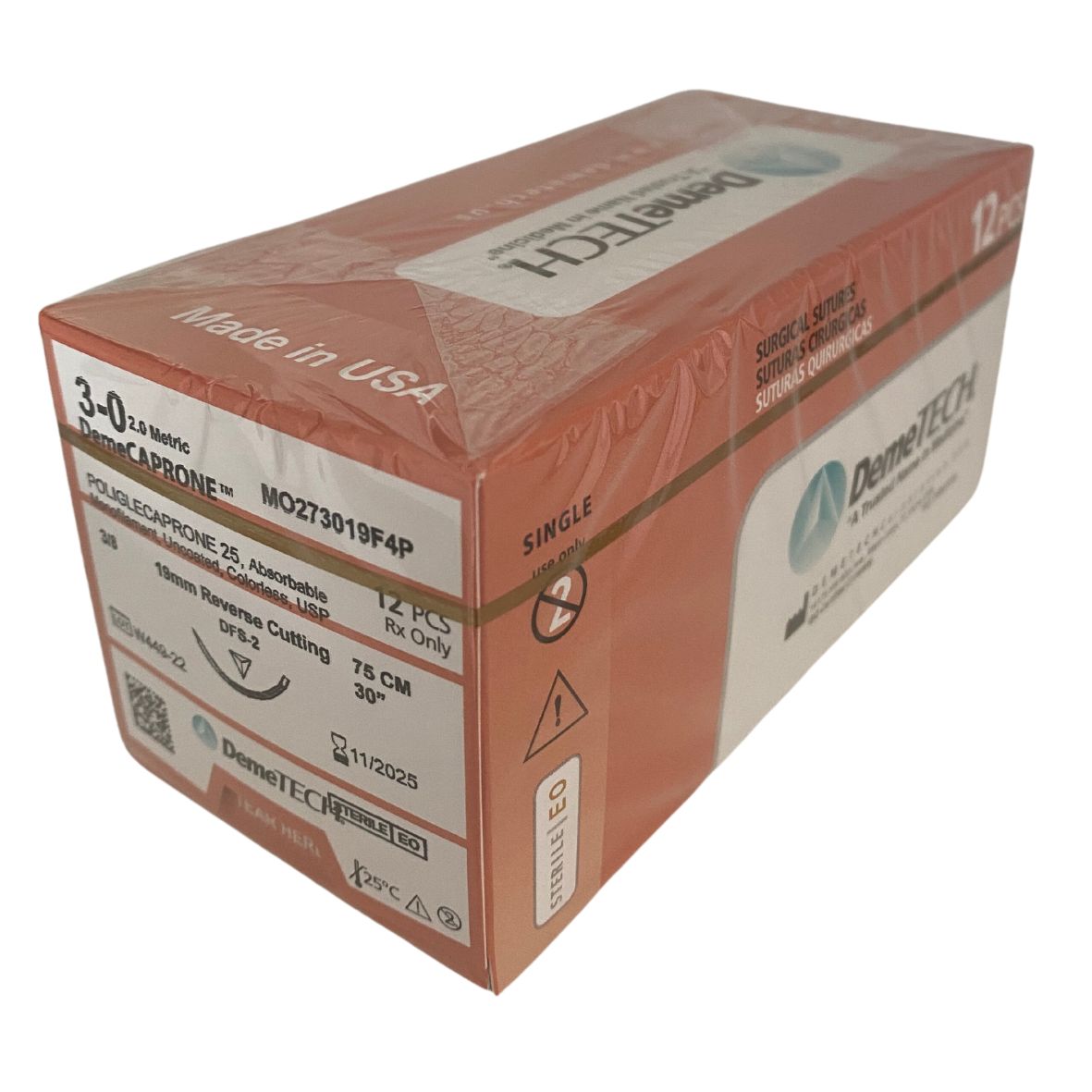 DemeCAPRONE (Poliglecaprone 25) is a synthetic monofilament absorbable suture composed of Poly (glycolic-co-caprolactone) copolymer (PGCL) and is supplied violet and colorless. DemeCAPRONE (Poliglecaprone 25) is available in sizes 2 through 6/0.